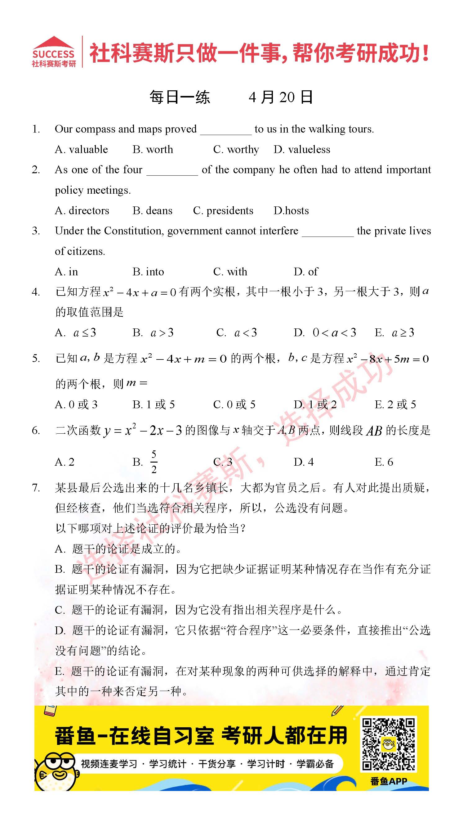 导读:考研是一场持久战,保持良好的学习习惯,是能确保复习高效的关键。今天社科赛斯MBA备考网小编整理了“2022管理类联考4月20日每日一练及答案”的内容,希望能对广大考生有所帮助。