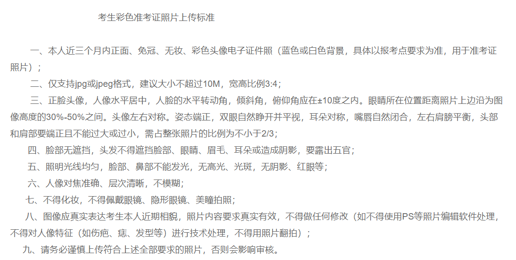 图像应真实表达考生本人近期相貌,照片内容要求真实有效,不得做任何修改(如不得使用PS等照片编辑软件处理,不得对人像特征(如伤疤、痣、发型等)进行技术处理,不得用照片翻拍);