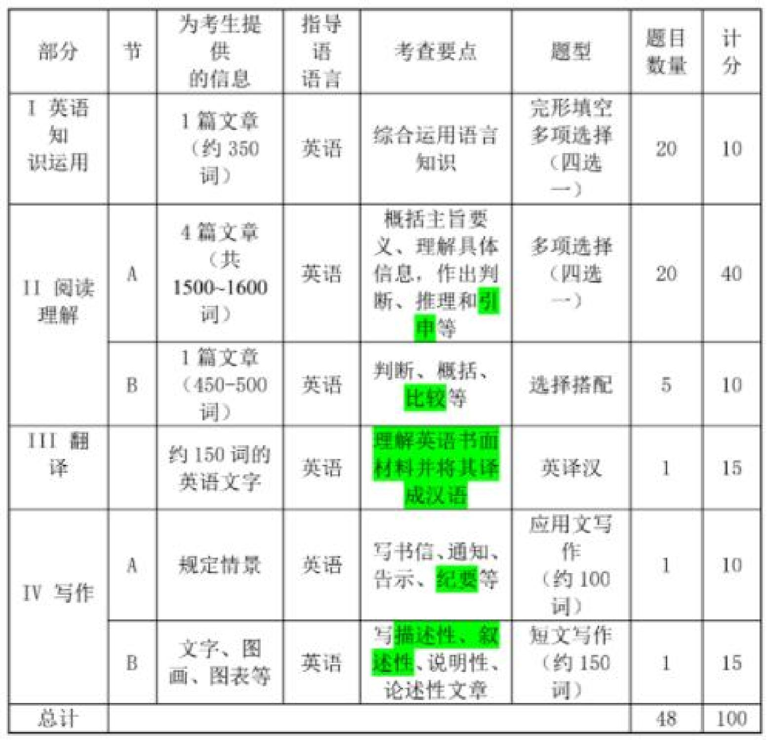 试题分四部分,包括英语知识运用、阅读理解、翻译和写作,共 48 小题。
