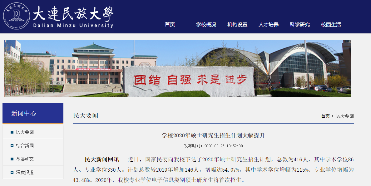 民大新闻网讯 近日,国家民委向我校下达了2020年硕士研究生招生计划,总数为416人,其中学术学位86人、专业学位330人。计划总数较2019年增加146人,增幅达54.07%,其中学术学位增幅为115%、专业学位增幅为43.48%。2020年,我校专业学位电子信息类别硕士研究生将首次招生。