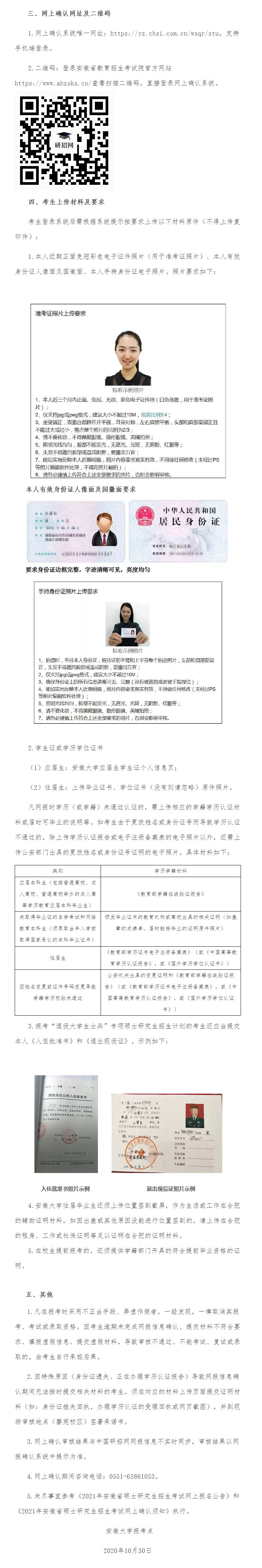 今年安徽大学报考点实行网上确认报名信息,确认期间将在网上审核考生上传的材料并通过系统向考生反馈审核结果。请所有考生务必仔细阅读此公告要求,及时查看审核结果,并按要求在规定时间内补充(修改)有关材料。未在规定时间进行网上确认以及未被审核通过的考生,报名信息无效,将不得参加考试。