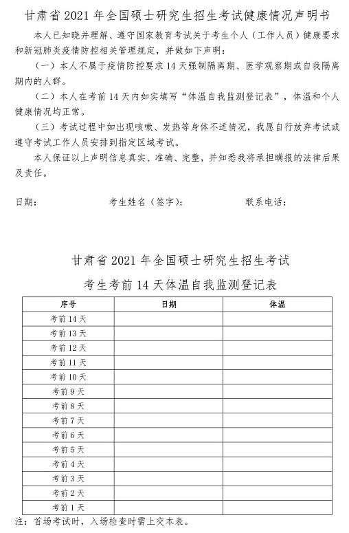 1.考生须于12月10日起,在“甘肃省教育考试院”(https://www.ganseea.cn/)、研招网或各报考点指定网站下载《2021年全国硕士研究生招生考试考生健康状况声明书》和体温自我监测登记表,通过“甘肃新健康”申领并打印健康码。自12月12日开始考生每日自行进行体温监测。
