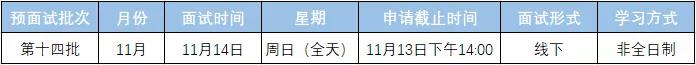 大家好!感谢您申请华东师范大学MBA项目。 本年度全日制预面试批次已结束。11月14日非全预面试批次为本年度最后批次,请有意愿报考华东师范大学MBA非全项目的考生抓紧时间申请。错过本年度预面试批次且符合报考条件的考生,如还有意愿报考华东师大全日制/非全日制MBA项目,请一志愿报考,初试通过后,于明年3月底或者4月初参加正常批面试(具体以官网公布通知为准)。 面试需注意事项将于面试前一周内以官方邮件形式发送至各位考生申请时预留邮箱,请注意查收。 更新至10月21日 注:预面试日期和方式将视疫情防控情况而定,若有变化,将另行通知,具体以考生所收到的官方邮件为准。 在招生流程上,华东师范大学MBA项目秉承科学选拔、公平公正、全面衡量、客观评价、择优录取、宁缺毋滥的基本原则,依据以下四个步骤进行录取工作:①网上申请,②提前批面试,③全国MBA管理类联考,④正常批面试。