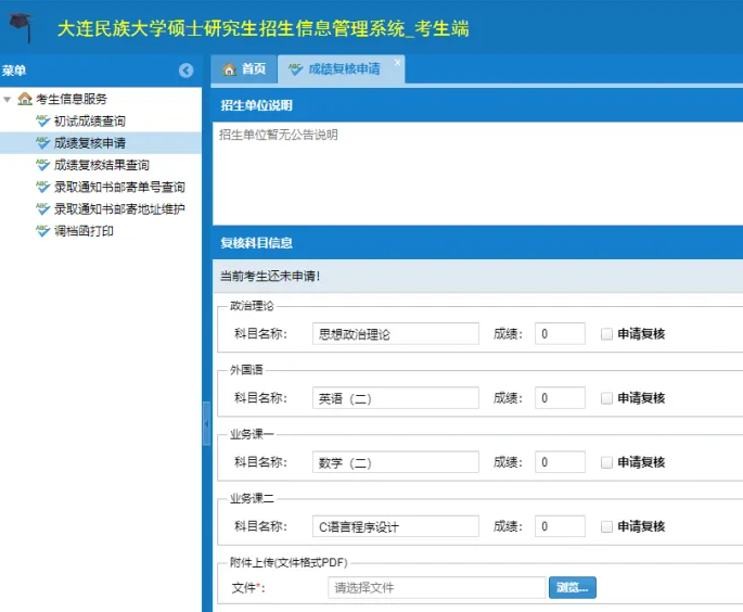 考生登录“大连民族大学硕士研究生招生信息管理系统”提交复核申请,同时须将本人身份证(正反面)及准考证扫描件合成一个PDF文件在成绩复核申请界面的“附件上传”处提交。