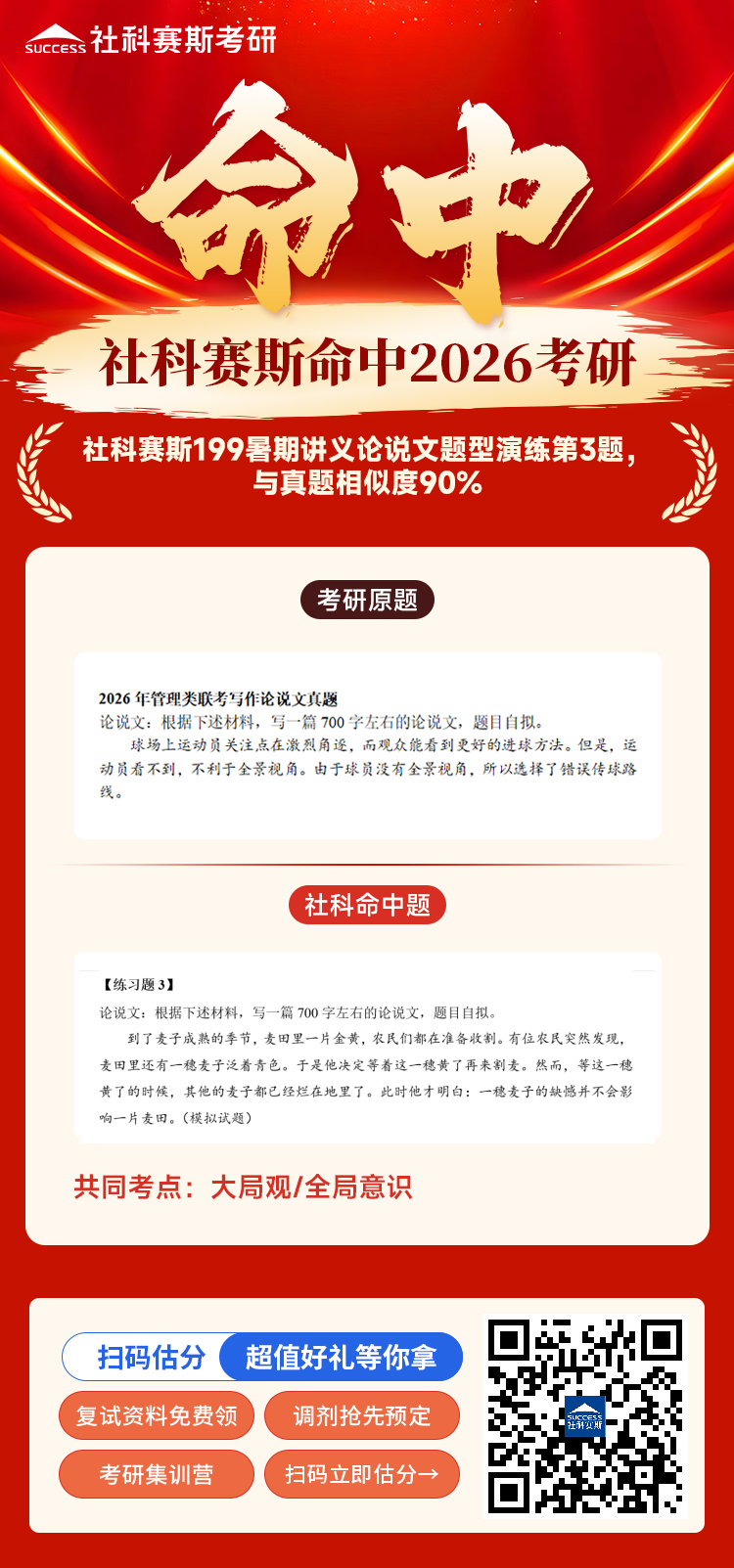导读:恭喜社科赛斯押种2026MBA EMBA MEM MPA MPAcc管综写作论说文真题论说文。社科赛斯 199 暑期写作讲义(MBA 系统写作讲义)有一道...