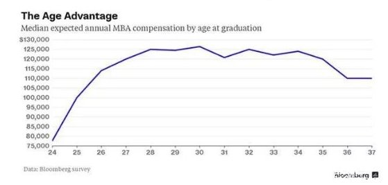 2014年调查了10000名全职MBA毕业生后发现,在30岁之前,得到MBA学位的年纪越大,薪水也就越高。这也能够解释的清楚:一个28岁的MBA毕业生比一个24岁的有更多经验和教育。令人惊奇的是,30岁之后,经验和教育带来的优势迅速下降。