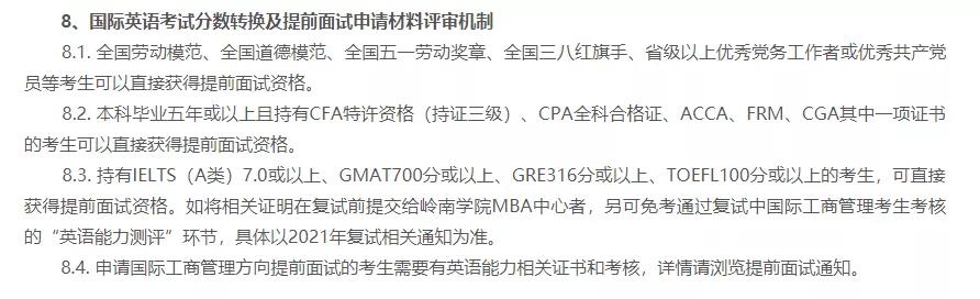8.3. 持有IELTS(A类)7.0或以上、GMAT700分或以上、GRE316分或以上、TOEFL100分或以上的考生,可直接获得提前面试资格。如将相关证明在复试前提交给岭南学院MBA中心者,另可免考通过复试中国际工商管理考生考核的“英语能力测评”环节,具体以2021年复试相关通知为准。