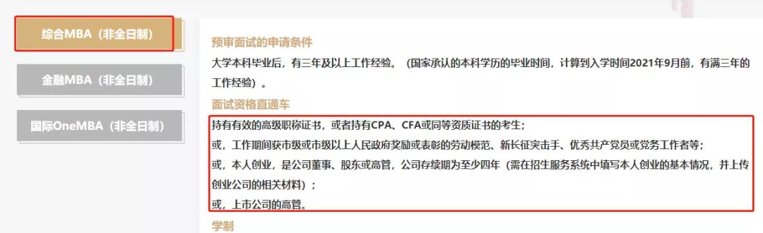 持有有效的高级职称证书,或者持有CPA、CFA或同等资质证书的考生;或,工作期间获市级或市级以上人民政府奖励或表彰的劳动模范、新长征突击手、优秀共产党员或党务工作者等;或,本人创业,是公司董事、股东或高管,公司存续期为至少四年(需在招生服务系统中填写本人创业的基本情况,并上传创业公司的相关材料);或,上市公司的高管。