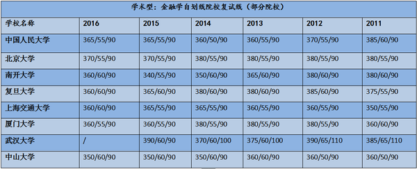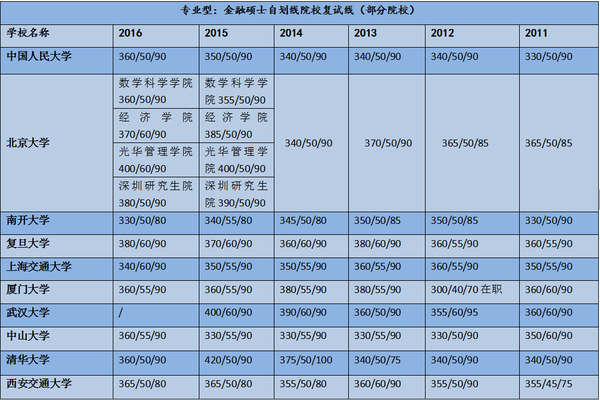 分数线很大程度上反应了备考难度,是择校时必须考虑的因素。开设金融学专业的院校中,一部分是自划线,一部分是国家线。下面是2011年到2016年金融学专业的复试分数线,希望能帮助大家了解各高校的备考难度。