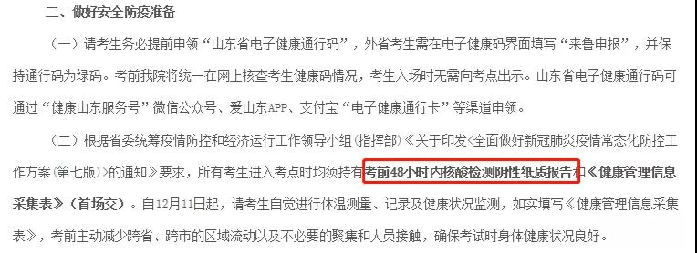 山东省教育招生考试办发布的22考研考生须知中明确了“所有考生进入考点时均须持有考前48小时内核酸检测阴性纸质报告和《健康管理信息采集表》(首场交)”。