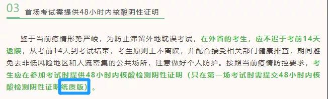 考生应在参加考试时提供48小时内核酸检测阴性证明(只在第一场考试时需提交48小时内核酸检测阴性证明纸质版)。