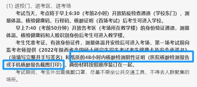 考生凭准考证、有效身份证件,测量体温并安检后可进入考场,第一场考试前向监考老师提供《2022年陕西省全国硕士研究生招生考试考生健康卡及安全承诺书》(须填写完整并手写签名)和纸质的48小时内核酸检测阴性证明(医院核酸检测报告或手机核酸报告截图打印),两份材料按照顺序装订在一起。