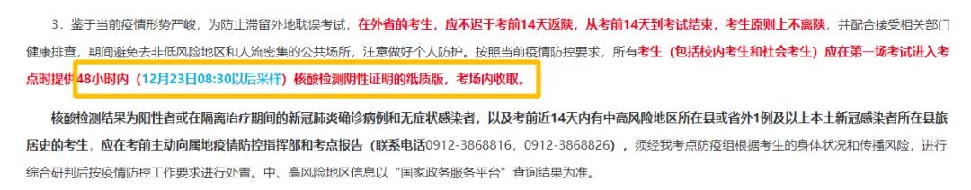 所有考生(包括校内考生和社会考生)应在第一场考试进入考点时提供48小时内(12月23日08:30以后采样)核酸检测阴性证明的纸质版,考场内收取。