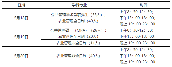 (2)专业基础知识测试:开放性考试,以口头回答的方式进行;评价方式为定性评价,分“合格”、“不合格”两个等级,不合格者不予录取。公共管理学硕复试科目是管理学原理,参考书目是《管理学:原理与方法》(第五版),周三多等主编,复旦大学出版社,2009年出版;公共管理专硕复试科目思想政治理论(参考书目参照教育部考试大纲)和管理学原理(参考书目《管理学:原理与方法》(第五版),周三多等主编,复旦大学出版社,2009年出版);农业管理专硕复试科目是公共管理学(二),参考书目是《公共行政学》(第四版),张国庆主编,北京大学出版社,2017年出版;《公共政策学》(第二版),宁骚主编,高等教育出版社,2016年出版;《公共管理硕士MPA系列教材》,张成福、党秀云著,中国人民大学出版社,2001年出版。