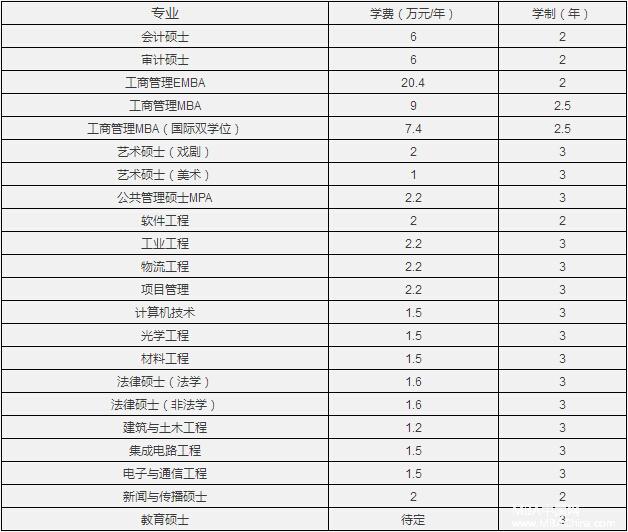 按物价部门批准或备案标准收取,其中会计硕士(非定向)3万元/年(学制2年),会计硕士(定向)5万年/年(学制2年),软件工程2万元/年(学制2年),艺术硕士(戏剧)2万元/年(学制3年),艺术硕士(美术)1.5万元/年(学制3年),其他类别、领域1万元/年。