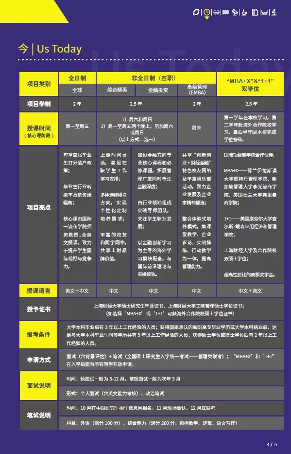 上海财经大学MBA招生采取“W+D预面试”政策。申请人在参加联考之前提前参加面试,项目根据考生在线申请所提交的报名信息进行全面的背景评估(Width),并根据背景评估结果,对符合条件的考生进行较为深入的预面试考察(Depth)。
