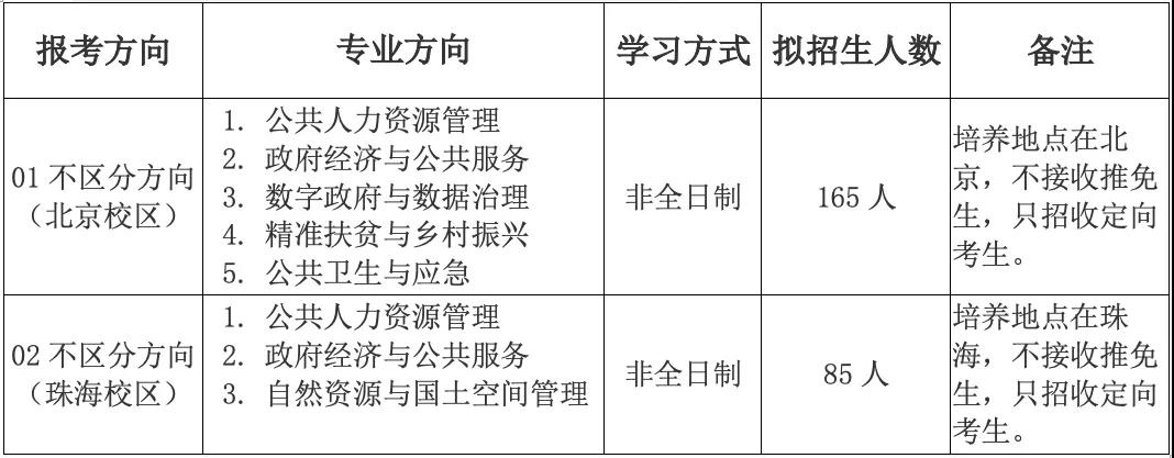 北京师范大学是教育部直属重点大学,是一所学科实力位居全国高校前列的百年学府,2017年入选世界一流大学建设计划。北京师范大学是全国首批培养公共管理硕士专业学位(Master of Public Administration,简称MPA)的院校之一,也是首批获得公共管理一级学科博士学位授予权的高校之一。2018年,北京师范大学公共管理专业学位教育在全国首次专业学位水平评估中获评A-。 基于当前的时代要求和学校自身的定位及特色,北京师范大学MPA教育以“掌握公共管理知识和技能,具备公共服务精神和国际视野,能够引领经济社会变革和发展的政府部门及非政府公共机构高层次管理者”为人才培养目标,不断推动教育模式创新,形成“扎实的学科依托、充足的教学资源、显著的培养效果、多元的活动服务”的办学特色,成为国内重要的MPA人才培养基地。 二、招生人数与招生方向 - 招生计划:拟招收250人。 - 报考方向:2022年招生分“01不区分方向(北京校区)”和“02不区分方向(珠海校区)”两个报考方向。 - 主要招生专业方向:公共人力资源管理、政府经济与公共服务、数字政府与数据治理、自然资源与国土空间管理、精准扶贫与乡村振兴、公共卫生与应急。 不同报考方向(校区)招生计划见下表: 说明:10月网上报名时只填报报考方向,正式录取后再分专业方向。 三、报考条件 考生报名须满足以下条件: 1.考生须为中华人民共和国公民,拥护中国共产党的领导,品德良好,遵纪守法。 2.身体健康状况符合国家和我校规定的体检要求。 3.学历和工作条件必须符合下列情况之一: (1)获得国家承认的大学本科学历已满3年并有相应的工作经历(从毕业后到2022年9月前)。 (2)获得国家承认的高职高专学历已满5年并有相应的工作经历(从毕业后到2022年9月前)。 (3)获硕士、博士学位已满2年并有相应的工作经历。 (4)在境外获得的学历(学位)证书须通过(中国)教育部留学服务中心认证,资格审查时须提交认证报告。 非应届在读研究生(含单证专业学位硕士生)报考,须在报名前征得就读院校同意,并在录取时先办理原就读院校的退学手续。我校不允许研究生同时攻读两个以上(含)不同层次或相同层次的学位。 四、报名 考生报名前应仔细阅读我校的报考条件,确认完全符合条件后再进行网上报名。网上报名时必须如实、准确地填写信息。不符合报考条件或弄虚作假者一律不予录取,报考资格审核将在录取阶段进行。 报名包括网上报名和网上(现场)确认两个阶段,缺一不可。考生应于2021年10月(具体以教育部公布的时间为准)登陆“中国研究生招生信息网(http://yz.chsi.com.cn)”浏览报考须知,按教育部、省级教育招生考试管理机构、报考点以及报考招生单位的网上公告要求报名,并于规定时间到报考点进行网上(现场)确认。考生应认真核对报名信息,报名结束后报名信息不允许修改,因填写错误造成的一切后果由考生本人承担。 报名关键信息提醒 - 报考专业: 公共管理(专业学位硕士,专业代码125200) - 考试科目: 管理类联考综合能力(199)、英语二(204) - 报考类别: 定向就业 报名费直接在“中国研究生招生信息网”缴纳。逾期不再补报,也不得再修改报名信息。 五、考试 考试分初试和复试两阶段。 (一)初试 1.初试时间:2021年12月25日至12月26日(每天上午8:30-11:30,下午14:00-17:00)。 2.初试科目 ① 199-管理类联考综合能力(满分200分)、② 204-英语二(满分100分),均为笔试。 其中管理类联考综合能力为全国联考科目,内容请参考教育部考试中心编制的最新考试大纲;英语二为全国统考科目,内容请参考教育部考试中心统一编制的最新考试大纲。 3.准考证从中国研究生招生信息网下载。考生凭准考证及有效居民身份证参加初试。 (二)复试(考前面试与正常批复试) 1.考前面试 (1)考前面试日程安排(2022年考前面试申请工作已结束) 2.正常批复试 正常批复试包括以下三类考生: ① 初试成绩达到我校MPA复试线,参加考前面试但未获得有条件录取资格或未获得递补资格的考生; ② 初试成绩达到我校复试线,参加考前面试获得递补资格,但未递补成功的考生; ③ 初试成绩达到我校MPA复试线,未参加考前面试的考生。 复试大约安排在2022年3月中下旬,届时将在我校研究生招生网公布具体时间。 (1)考前预录取 ① 参加考前面试并获得“有条件录取资格”的考生,初试成绩达到北京师范大学自主划线分数/国家线、报考资格和学历档案复审无误后,即可直接获得拟录取资格。 ② 获得“递补资格”的考生,可在“有条件录取资格”考生放弃或者初试成绩没有达到北京师范大学自主划线分数/国家线的情况下,按照考前面试成绩由高到低的排序依次递补,获得“有条件录取资格”。 未通过递补获得“有条件录取资格”的考生,自动进入正常批录取程序。 注:2022年本专业分数线是否按照北京师范大学自主划线分数/国家线,请届时以北京师范大学研招办发布的信息为准。 (2)正常批复试录取 正常批复试的考生,按照报考方向根据考生总成绩(初试成绩+复试成绩)从高到低依次录取。总成绩相同时,按初试总分从高到低依次录取。复试不合格考生不予录取。 录取类别为定向就业。定向就业研究生的人事档案、户口均不迁入北师大,毕业后须回定向单位就业。定向就业研究生均须在被录取前与招生单位、用人单位分别签订定向就业协议。考