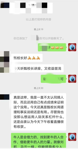 “你认识的人有多少,你的世界就有多大”。甄总认为,结交高人成大事,结交小人不坏事,要拒绝无效社交。甄总建议,把微信当做人脉拓展的利器,并展示了和多位学员的聊天记录,向大家示范了微信沟通过程中必备的措辞,结构,语气等,内容极为精彩。