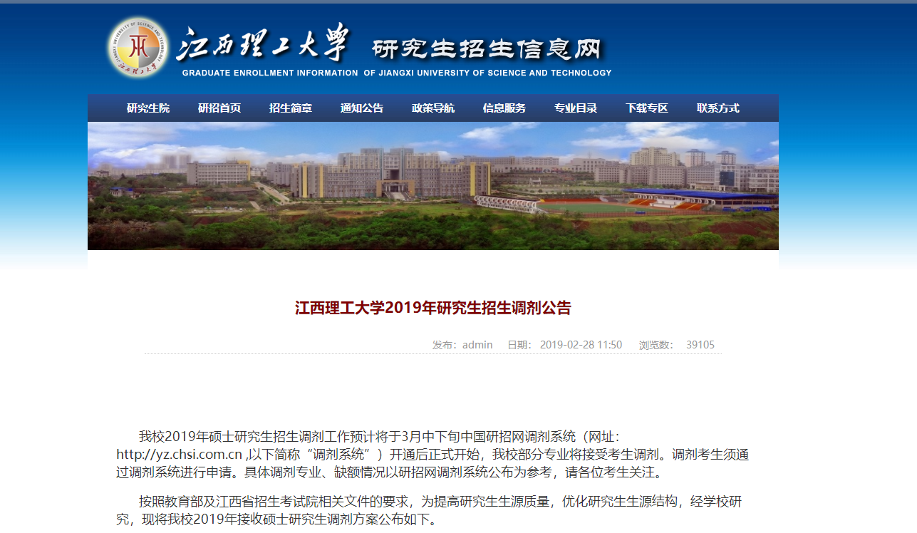 按照教育部及江西省招生考试院相关文件的要求,为提高研究生生源质量,优化研究生生源结构,经学校研究,现将我校2019年接收硕士研究生调剂方案公布如下。