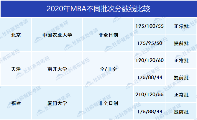 不难发现,提前批和正常批两条分数线之间确实存在不小的差距。正常批MBA分数线通常高于国家线,而提前面试通过的考生一般参照国家线即可。