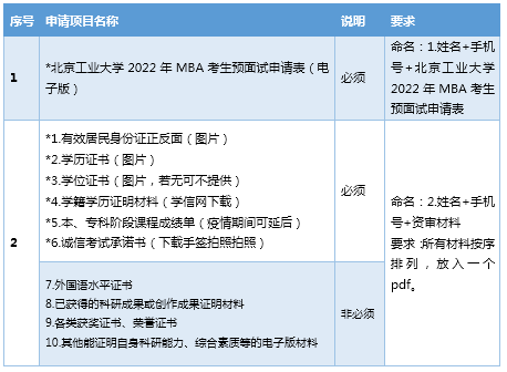 2.申请材料:请将《北京工业大学2022年MBA考生预面试申请表》和资审材料放入同一文件夹(见原文链接附件),压缩打包后发送,邮件名称和文件夹名称为“第x批2022MBA预面试+姓名+手机号”。