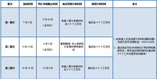 5、审核通过的考生请在系统中选择是否参加面试,参加面试的考生请选择适合自己时间的首选面试批次,如批次选择成功,则表示该考生已成功进入该批次名单;如系统提示该批次人数已满,请确认该批次是否为备选批次,这样,如果该批次有其他考生放弃面试,中心将酌情将该考生加入该批次。然后请选择其他批次为首选批次。选择批次成功后,系统状态为“等待面试通知”。申请考生可在面试前3-5个工作日登录系统,在备注栏中查询面试的具体时间和地点。