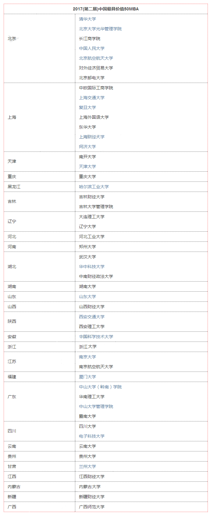 导读:由商学院传播联盟、中国MBA EMBA精英荟、品牌时代国际传媒联合主流财经教育媒体主办的于日前发布了《2017(第二届)中国最具价值50MBA》。