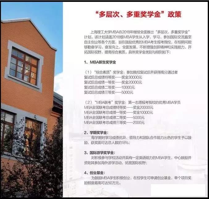 励志奖学金:第一志愿报考华东理工大学2018年MBA并被录取,考生在规定时间段提出申请并提供指定考辅机构培训证明后评定。指定考辅机构包括:泰祺教育、众凯教育、华是学院、华章教育、社科赛斯、太奇教育、华文教育、浦江商学院、杰德教育、考研之家、都学网等。