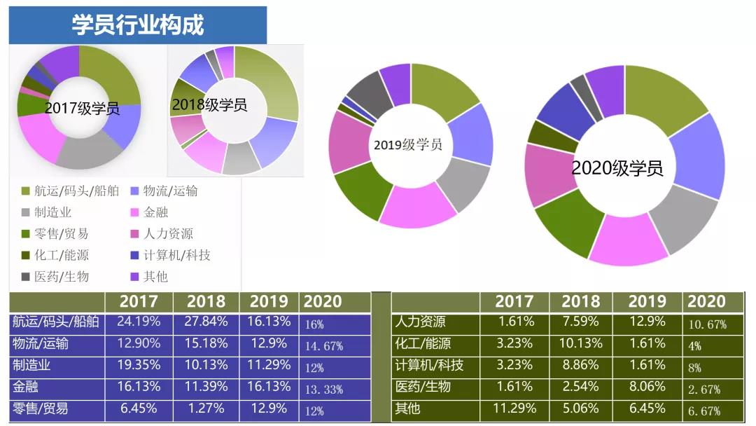 上海海事大学MBA以供应链物流的工商管理教育为主要品牌,重点突出港航优势,兼顾综合管理教育。众多的上海海事大学MBA毕业生已成为大型企业尤其是海运、港口和物流企业的CEO、CFO、C LO及其他高层管理人员。海大MBA教育中心被誉为“航运界的黄埔军校”。截止2021年,我校累计招收MBA学员5000余 人,已获得学位4800余人,境外合作办学MBA近600人,如今,数千名海大MBA/EMBA校友活跃在各行各业的管理岗位上,为国家经济建设贡献着自己的力量,一批优秀毕业生已走上重要领导岗位。