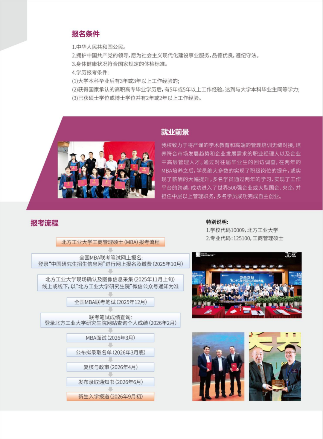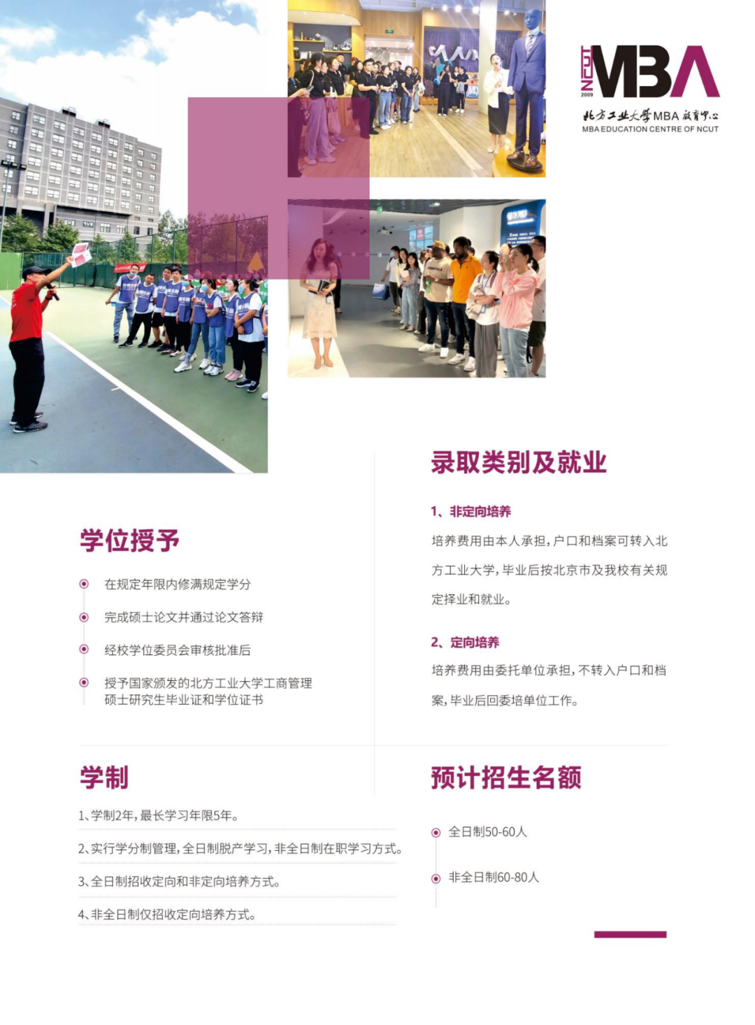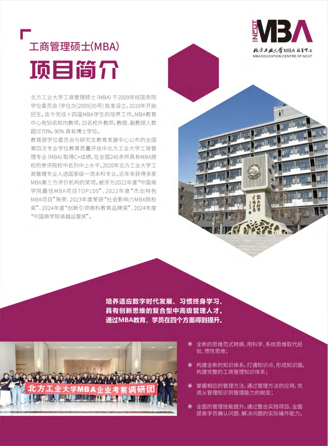 导读:项目简介北方工业大学工商管理硕士(MBA)于2009年经国务院学位委员会(学位办[2009]35号)批准设立,2010年开始招生,迄今完成十四届MBA学生的